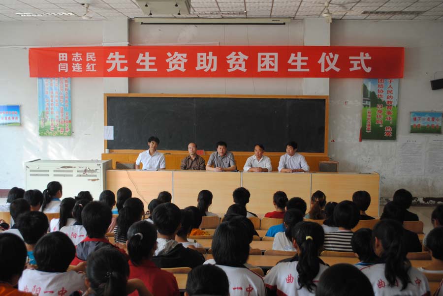 2012年9月7日下午,藍太集團董事長閆連紅、田志民董事長在百忙之中,親臨曲陽一中,對該校今年考入大學的15名貧困學生、以及在校的100名貧困學生實施愛心資助。閆董事長資助的15名貧困大學生每生每年2000元,直至大學畢業;田志杰資助的100名在校貧困生每人500元,共計5萬元。這一感人之舉充分體現了兩位董事長對我校貧困學子的莫大關懷,對曲陽一中教育事業發展的深情關注。