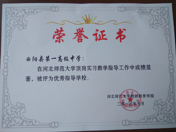 在5月11日結束的河北師范大學頂崗實習教學指導工作經驗交流會上,曲陽縣第一高級中學因在頂崗實習教學指導工作中成績顯著,被評為優秀指導學校。