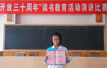 2009年4月27日,在曲陽一中大階梯教室舉行全縣“改革開放三十周年”讀書教育活動演講(講故事)比賽。本次比賽是在中共曲陽縣委宣傳部統一組織下,全縣中小學生廣泛參加的活動。比賽中選手們聲情并茂的演講,給觀眾和評委留下了深刻的印象。選手們都能緊緊圍繞改革開放以來,結合自己和家鄉發生的巨變和偉大祖國取得的輝煌成就,講出了自己的感受和心聲,抒發了當代中學生熱愛祖國、熱愛社會主義的情感。經過激烈角逐,最終高中組曲陽一中學生張凌云、代國強、馮璇三位同學分別榮獲一等獎、二等獎、三等獎。